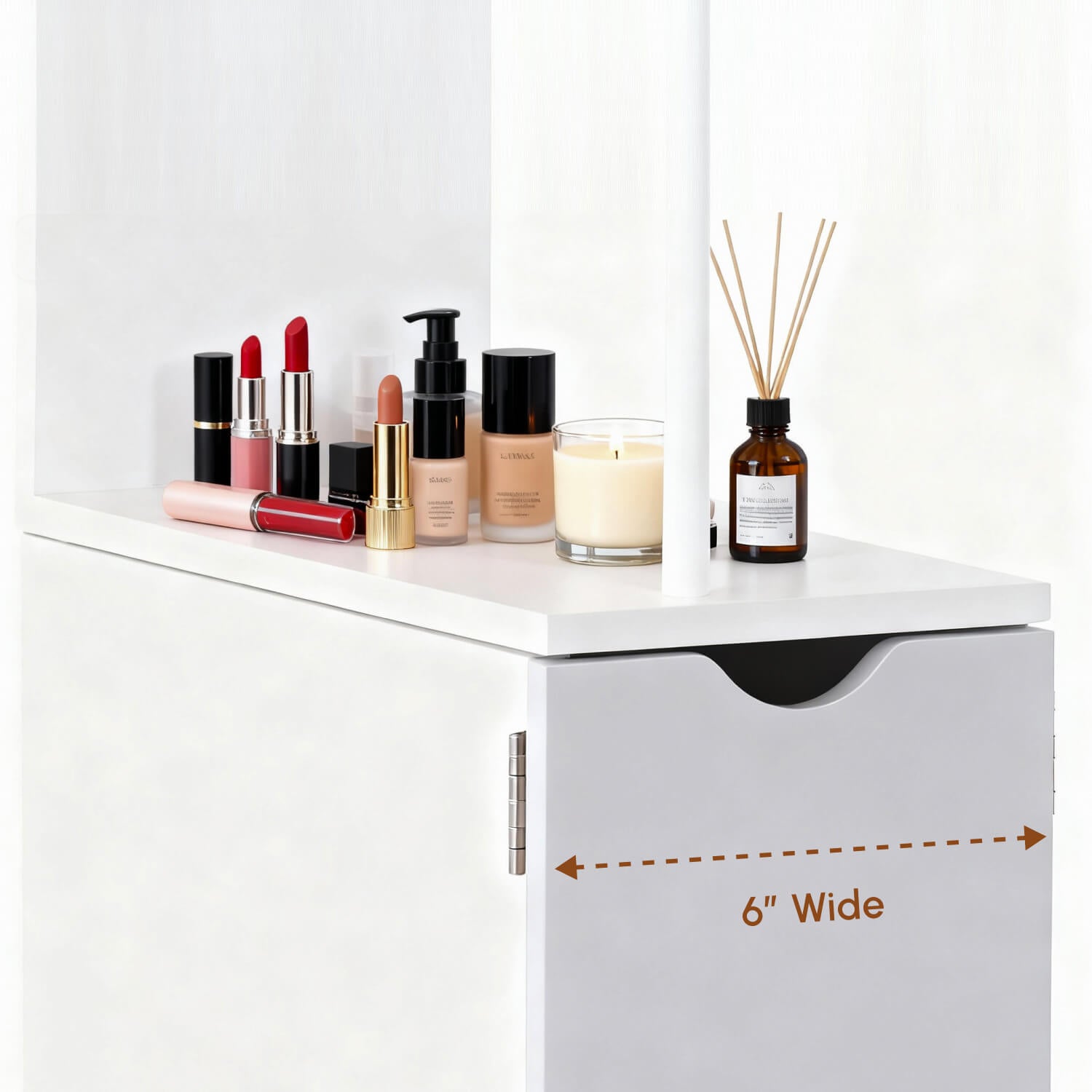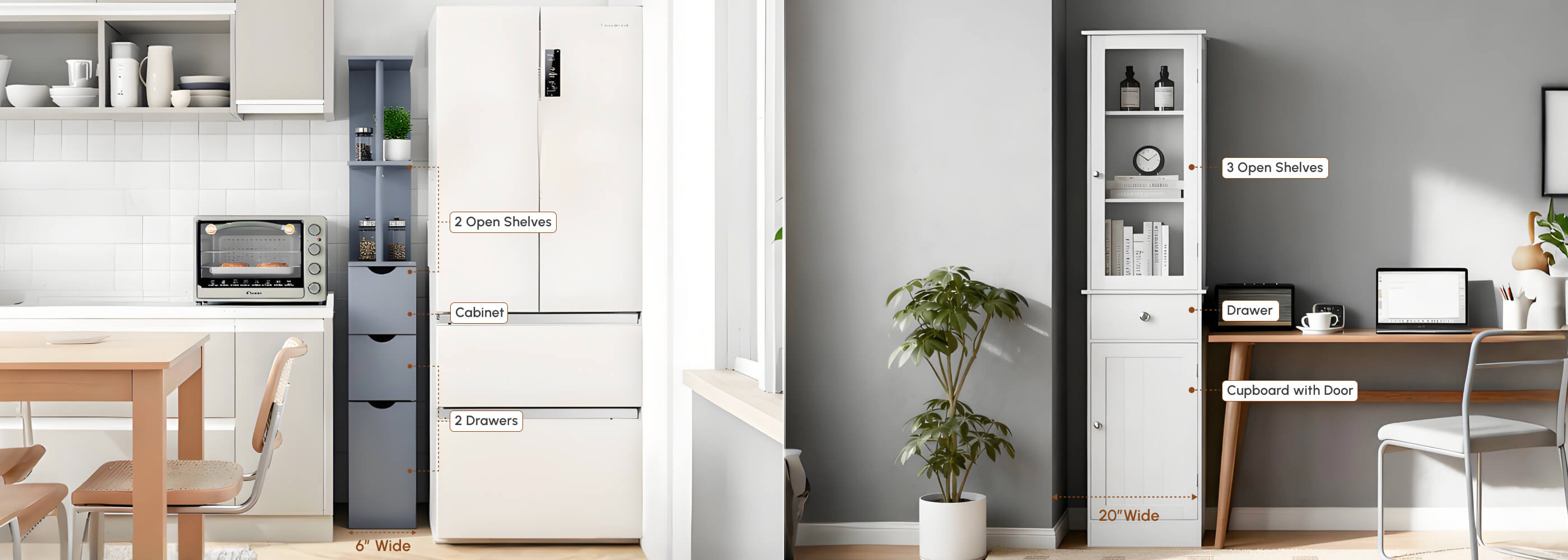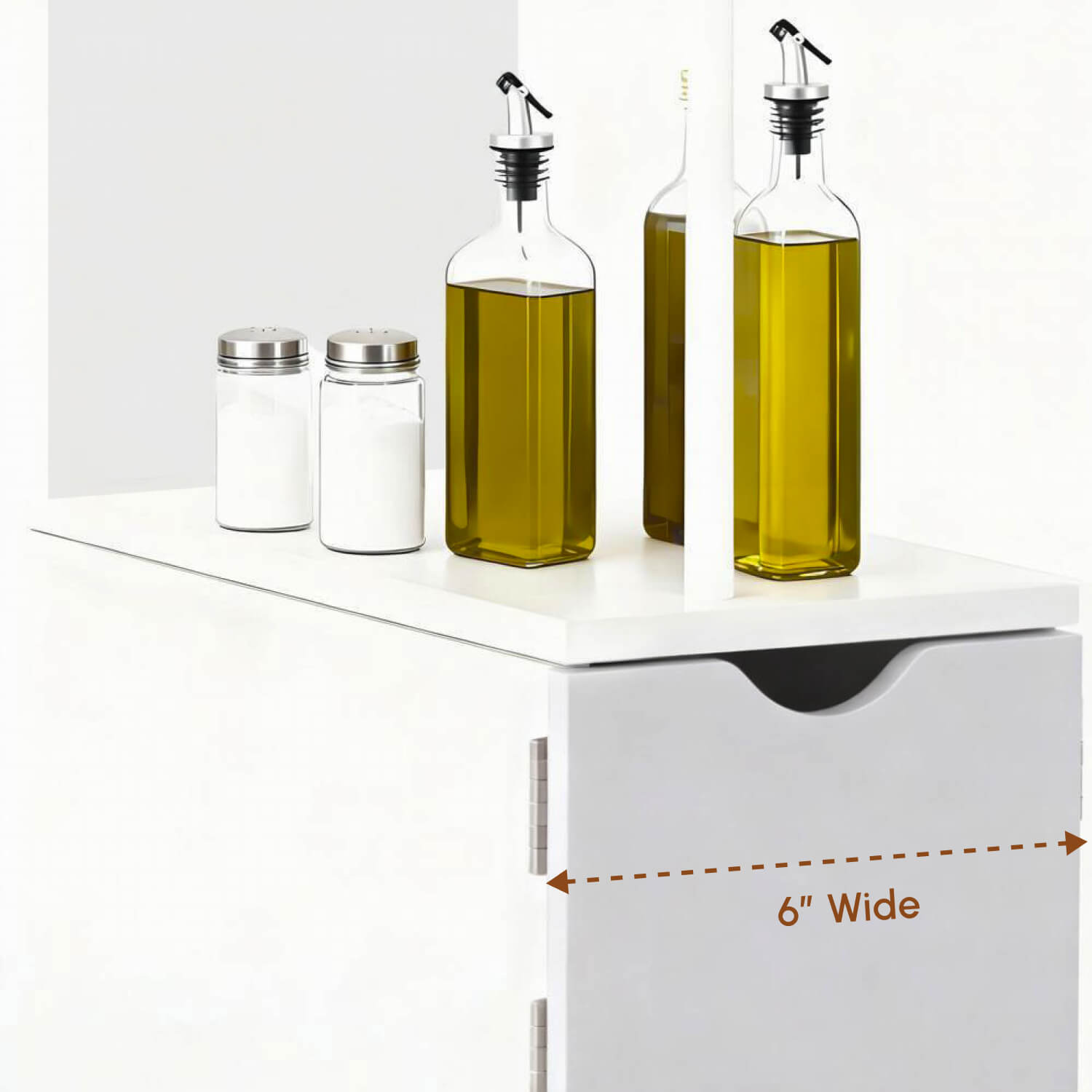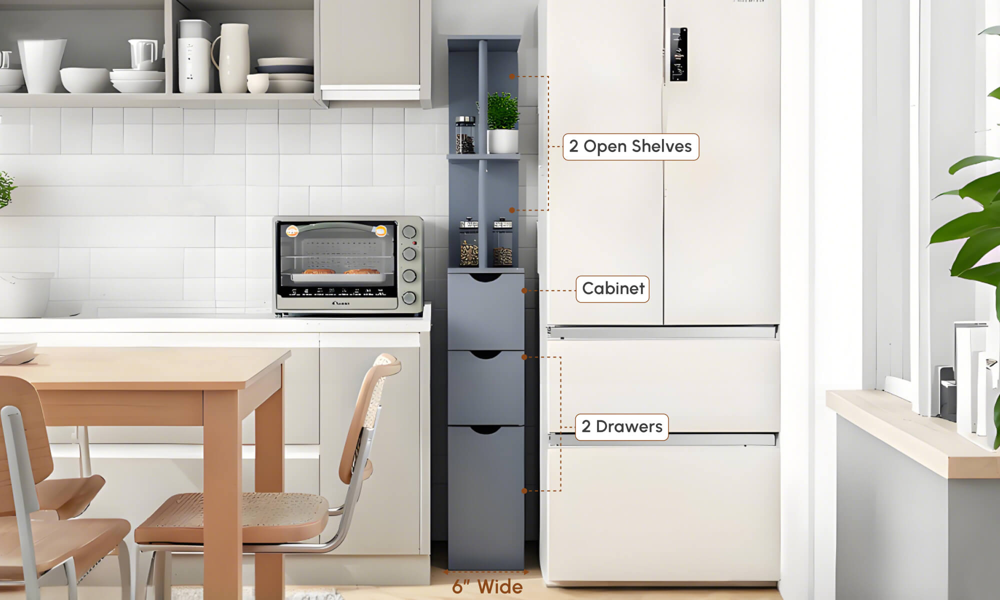 At only 6 inches wide, each cabinet slides neatly between appliances or along walls, giving you room for spices, toiletries, or cleaning essentials without changing your layout.