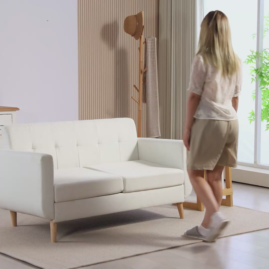 2 Seater Sofa, Modern Tufted Fabric Couch with Wood Legs for Small Space, Cream White