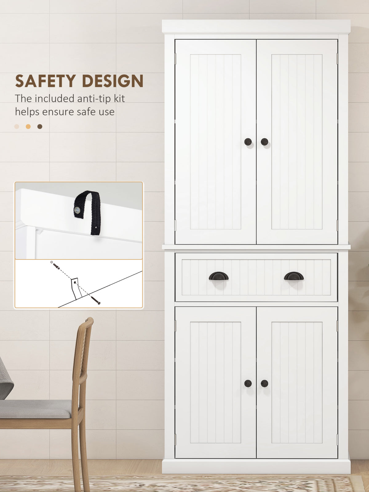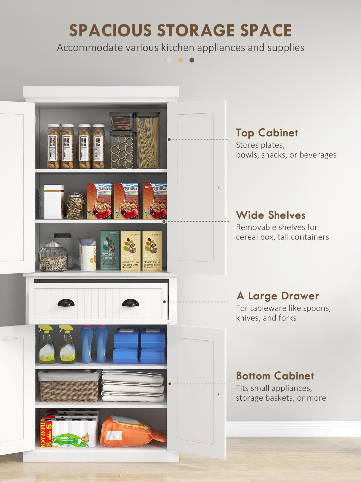 The spacious, freestanding pantry boasts a deep, smooth-gliding drawer and two sizable cabinets featuring magnetic doors, ideal for organizing a wide array of household essentials from silverware and knick-knacks to towels and cookware.