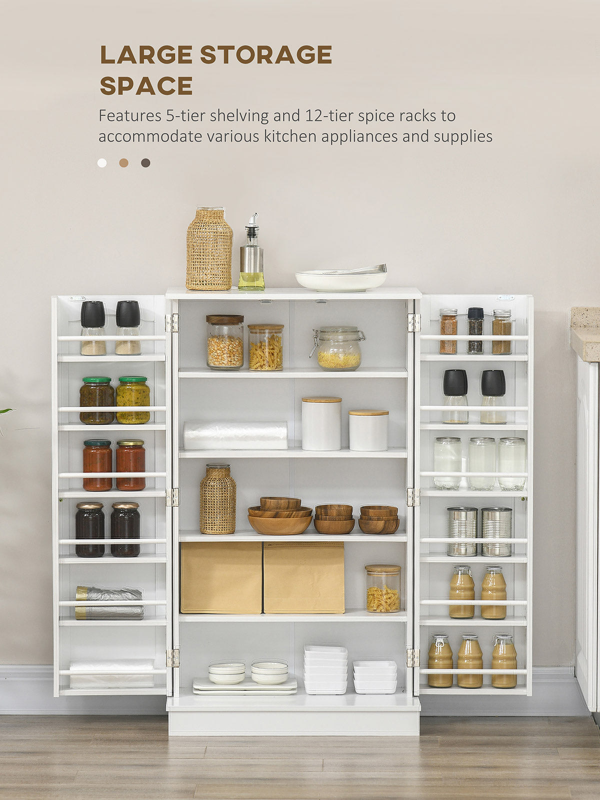 Facing a shortage of cabinets? No worries: The HOMCOM kitchen cabinet not only enhances your space with a stylish addition fitting your decor but also offers ample storage with its 5-Tier Interior Shelving and 12-Tier Side Racks behind the doors. Perfect for your new cookware, "company" dishes, cookbooks, and more.