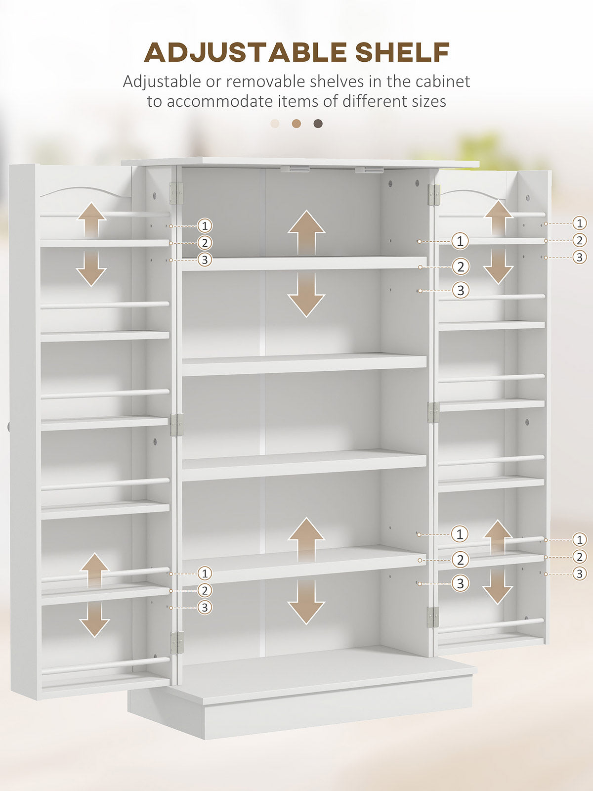 Discover unparalleled organization with our Freestanding Kitchen Pantry Cabinet's Adjustable Shelves! Tailored to meet your unique storage needs, these shelves effortlessly accommodate items of any size, from large cereal boxes to small spice jars. Transform your kitchen into a space of convenience and efficiency. Say goodbye to clutter and hello to a perfectly organized culinary haven!