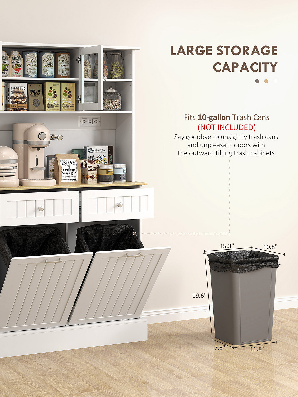 Explore unparalleled storage with this all-in-one kitchen cabinet. It boasts a hidden cabinet, 2 open shelves, large drawers, and a spacious countertop. Innovatively designed tilt-out cabinets are ideal for a laundry basket or 10-gallon trash can. With adjustable shelves for customized storage solutions, this cabinet transforms and elevates your kitchen space.